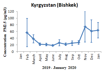 PM2.5 concentrations were retrieved from the US embassies monitors that were installed in 2018-2019 in the capitals of CA countries with a population between 800,000 - 2.5 million. Concentration patterns vary among different countries throughout the year depending on the seasons (Figure 2). Kyrgyzstan and Kazakhstan had the highest average PM2.5 concentrations in the winter, which is mostly related to emissions from fossil fuel use and biomass combustion. Uzbekistan and Tajikistan had different concentration patterns in comparison to Kyrgyzstan and Kazakhstan due to additional sources of fine particles, such as from dust storms. Overall, Turkmenistan had the lowest PM2.5 concentrations among CA countries throughout the year.
